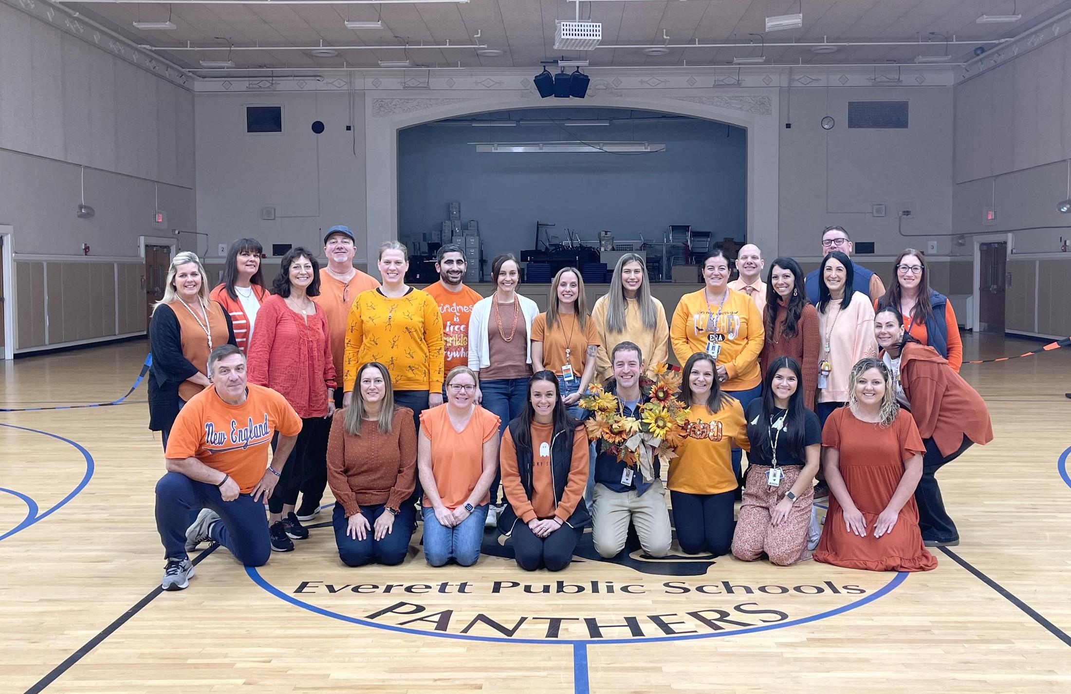 Parlin School teachers and staff gather on the school logo inside the gymnasium as part of the school’s Unity Day on Wednesday, October 22, 2025. Unity Days promote kindness, acceptance, and inclusion and are typically held during National Bullying Prevention Month each October. Great job, Parlin Panthers!