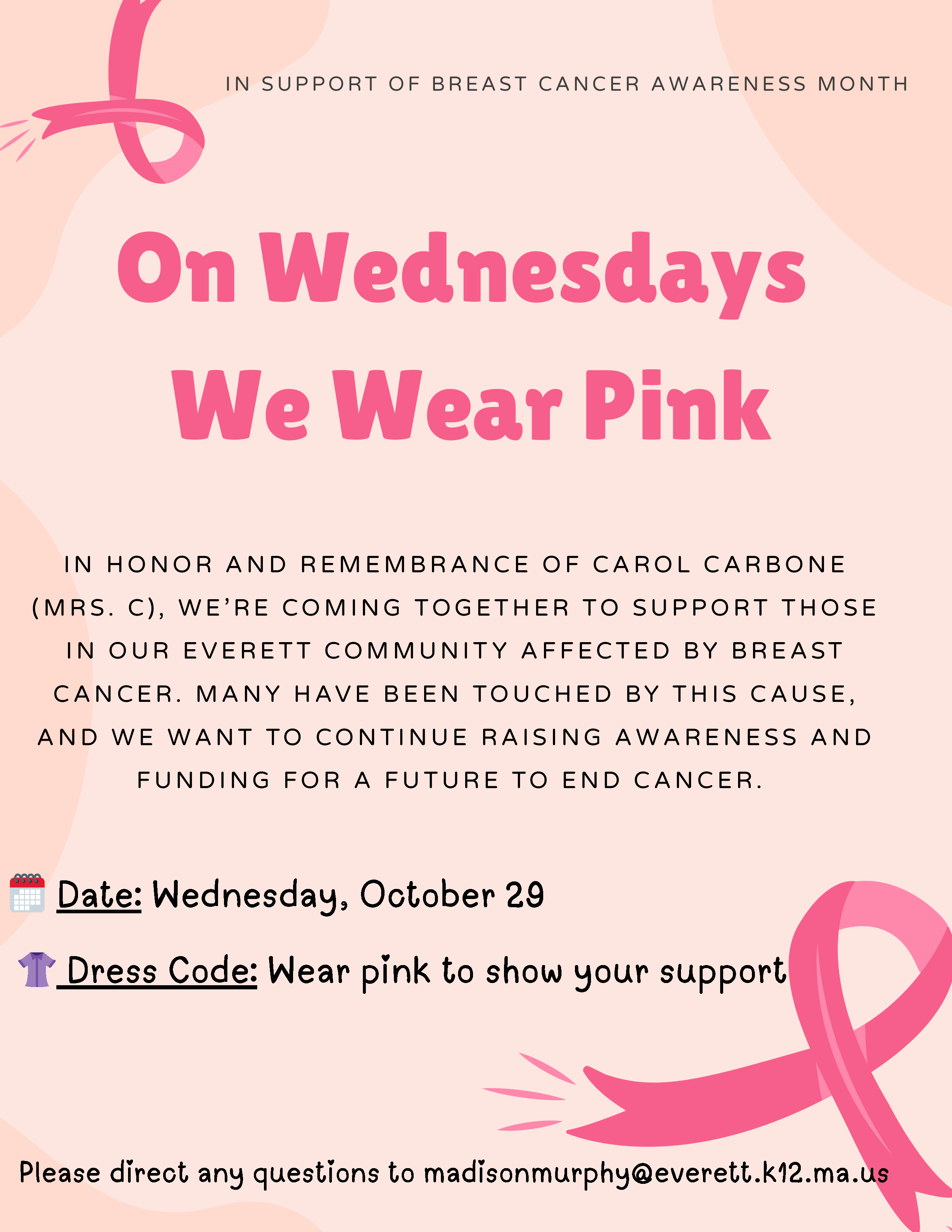 Parlin School Grade 7 science teacher Madison Murphy invites all Everett Public Schools (EPS) teachers and staff to participate in a Pink Day to support for breast cancer awareness on Wednesday, October 29, 2025.